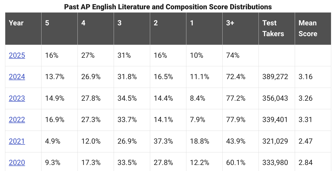 • In 2025, performance strengthened further: 16% earned a 5, 27% a 4, and 31% a 3—raising the pass rate to 74%. Scores of 1s and 2s dropped to just 26%, marking a notable shift toward higher achievement in AP Literature.